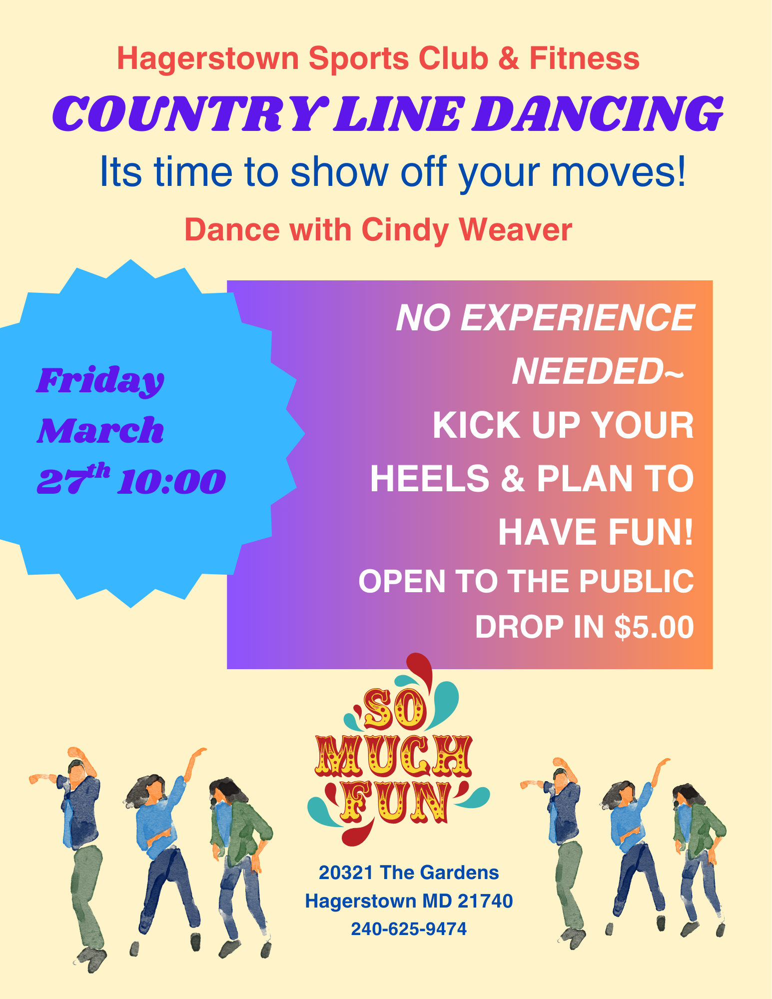 Line Dancing Fun at Hagerstown Sports Club & Fitness. No experience needed. Plan to laugh, kick up your heels & have fun. Bring a friend, the class is open to the community for a small drop-in fee of $5.00. Remember we do not take cash.